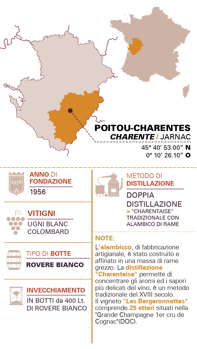 • NOTEViene realizzato esclusivamente con uve provenienti dal vitigno Les Bergeronnettes situato in Francia nella zona di Jarnac, regione Cognac. La materia prima sono i vini bianchi ottenuti dai vitigni Ugni Blanc, Folle Blanche, Colombard. Il Peyrot Cognac X.O si fregia della denominazione controllata più prestigiosa per un distillato del genere, la "1er Cru de Cognac" della "Grande Champagne". L'Extra Old delle cantine Peyrot invecchia con serenità in botti di rovere per oltre 25 anni e il risultato è un Cognac dal bouquet ammaliante, aromatico e strutturato. Il gusto morbido e setoso merita di essere assaporato con calma, da soli o in compagnia di buoni amici.