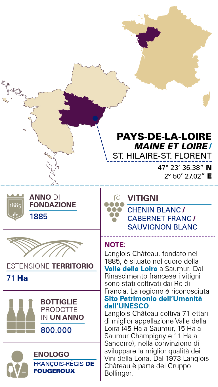 TIPOLOGIAAOC Crémant de Loire ZONA PRODUTTIVAComune di Saumur VITIGNO68% Chenin, 22% Chardonnay, 10% Cabernet Franc TIPOLOGIA DEL TERRENOSuolo silicio-calcareo, argilloso e scistoso VINIFICAZIONELeggera pressatura poche ore dopo la raccolta per mantenere il meglio dei primi succhi. Vinificazione separata tra «Cuvées» e «Tailles » per garantire il perfetto fabbisogno di ogni succo. Aggiunta di vini di riserva di annate più vecchie per portare complessità ed equilibrio a questa cuvée emblematica. COLOREOro pallido con bollicine delicate e raffinate PROFUMOPiacevoli aromi di fiori bianchi (tilia, biancospino) ABBINAMENTILa personalità di questo vino brillerà perfettamente durante un aperitivo con antipasti semplici ed eleganti. Temperatura di servizio: 8-10°C SAPOREPalato delicato con una freschezza intensa INVECCHIAMENTOInvecchiato per un minimo di 24 mesi sui lieviti. Dosaggio: 10 gr/l.