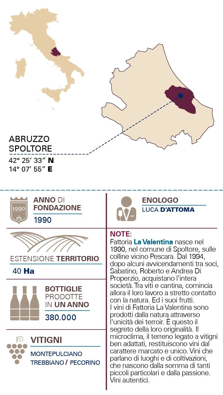 • ZONA PRODUTTIVAComuni di San Valentino, Spoltore ed Alanno. Altitudine 150-300 m s.l.m., esposizione sud-sud-ovest.
